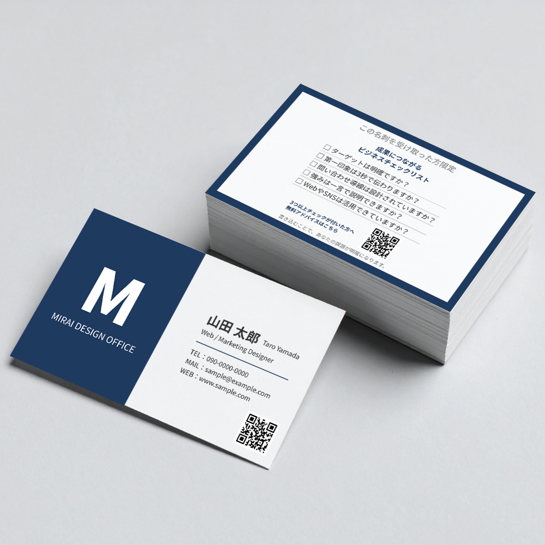 単なる情報伝達に留まらず、商談を有利に進めるための「武器」として機能する名刺デザインを追求しました。 |